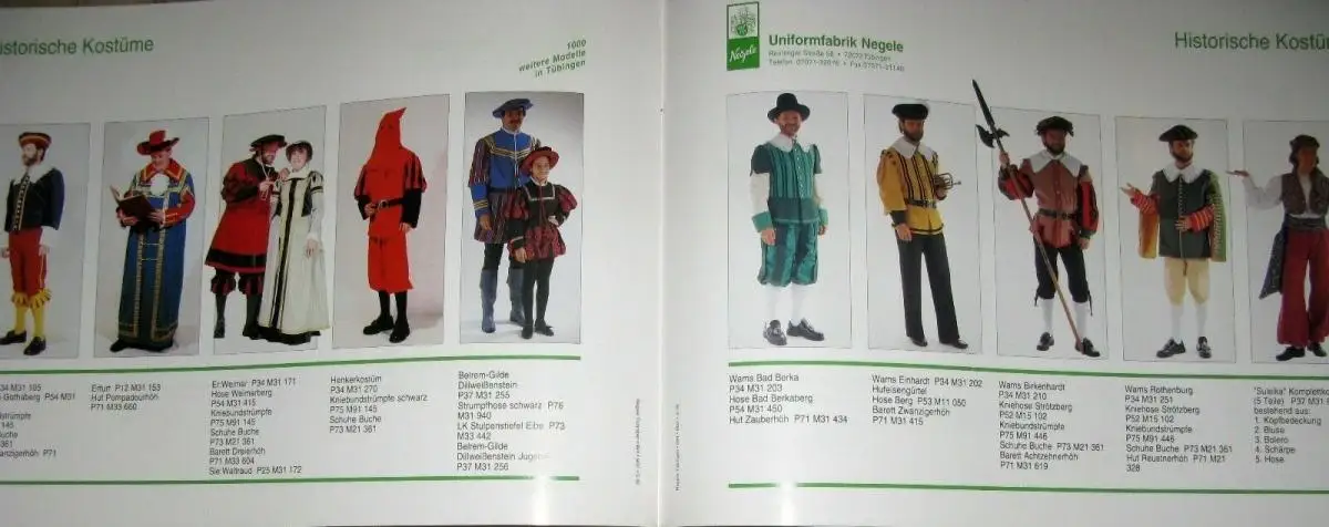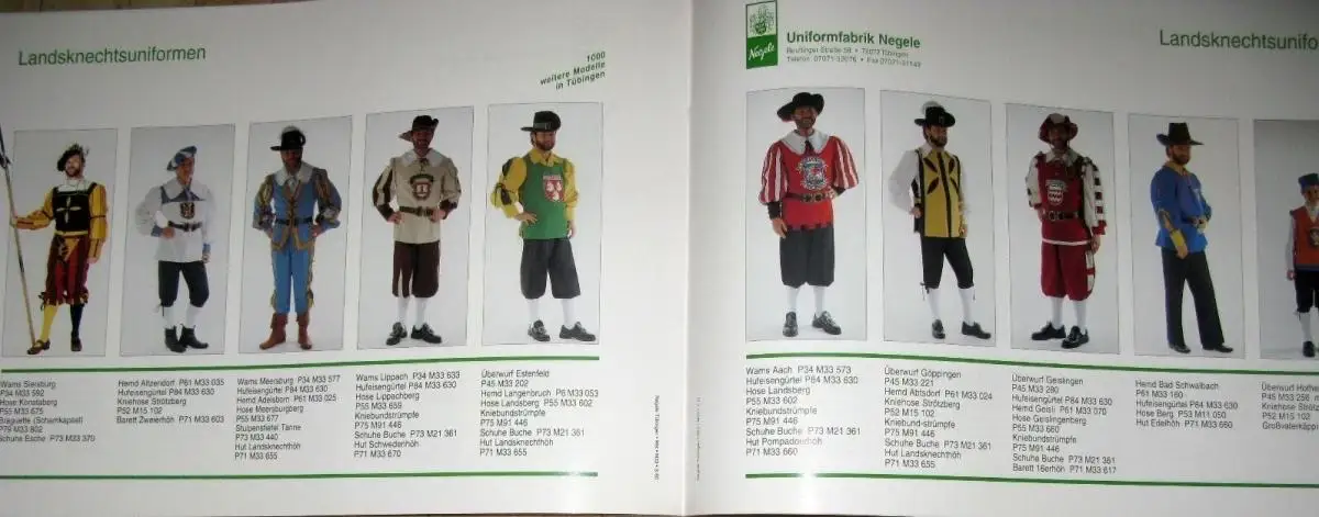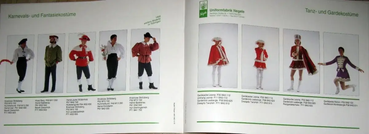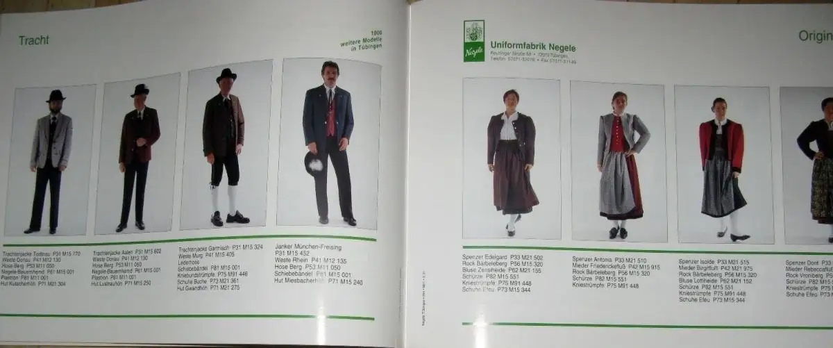 sehr guter Zustand, geringe Gebrauchs- und Alterungsspuren: kleiner Einriss oben am Rücken, Geschichte der Fa. seit 1886 - Beschreibung der Fa. - Auftragsformen und -abwicklung - Modell-Vielfalt - Uniformen - Klub-, Dienst- und Imagekleidung - Smoking, Messejacke, Gehrock, Frack, Cutaway - Reiter-, Jagd- und Schützenkleidung - Tracht - Originaltracht - Historische Kostüme - Historische Uniformen - Landsknechtsuniformen - Historische Reiter- und Schützenuniformen - Fasnetshäs / Narrenräte - Karnevals- und Fantasiekostüme - Tanz- und Gardekostüme - Westen, kartoniert, ca. 30 x 21, 80 Seiten mit vielen Bildern