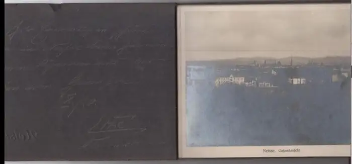 13,5 x 18,5 cm (Querformat) Schwarze Original-Kartonage mit seitlicher grüner Kordelbindung. 10 originale schwarzweiss-Photos auf Photopapier mit Bildern der Stadt mit wichtigen Bauwerken. Einbandvorderseite mit kleinem Einriß oben. Handschriftliche private Widmung im vorderen Innendeckel ' Zur Erinnerung an schöne Tage in Neiße beim gemeinsamen Scheiden aus der lieben alten Garnison. X / 20. Oberleutnant ' ( Name unleserlich ). Gutes Exemplar