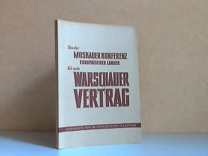 Schulstempel, das Buch ist ein Dachbodenfund, gebräunt, aus dem Inhalt: Deklaration der Moskauer Konferenz europäischer Länder zur Gewährleistung des Friedens und der Sicherheit in Europa (2. 12. 1954) - Erklärung der Sowjetregierung zur Deutschlandfrage (15. 1. 55) - Stellungnahme des Ministerrats der DDR zur Erklärung der Sowjetregierung zur Deutschlandfrage (20. 1. 1955) - Die internationale Lage und die Außenpolitik der UdSSR. Bericht V. M. Molotows vor dem Obersten Sowjet (8. 2. 1955) - Vorschlag der Sowjetregierung über Einschränkung der Rüstungen, Verbot der Atomwaffe und Beseitigung der Gefahr eines neuen Krieges (11. 5. 1955) - Kommunique über die Warschauer Konferenz (11. bis 14. 5. 1955) - Erklärung N. A. Bulganins auf der Warschauer Konferenz (11. 5. 1955) - Erklärung Otto Grotewohls auf der Warschauer Konferenz 11, 5. 1955) - Aus der Erklärung des Vorsitzenden des Ministerrats der Volksrepublik Polen, J. Cyrankiewicz, auf der Warschauer Konferenz (11. 5. 1955) - Aus der Erklärung des Ministerpräsidenten der Tschechoslowakischen Republik, V. Siroky, auf der Warschauer Konferenz (11. 5. 1955) - Warschauer Vertrag über Freundschaft, Zusammenarbeit und gegenseitigen Beistand europäischer Länder (14. 5. 1955) - Bericht des Ministerpräsidenten Otto Grotewohl vor der Volkskammer der DDR (20. 5. 1955) - Zustimmung zum Warschauer Vertrag durch die Fraktionen der Volkskammer (20. 5. 1955) Beschreibung vom Antiquariat Ardelt 3m5a Antiquariat Ardelt