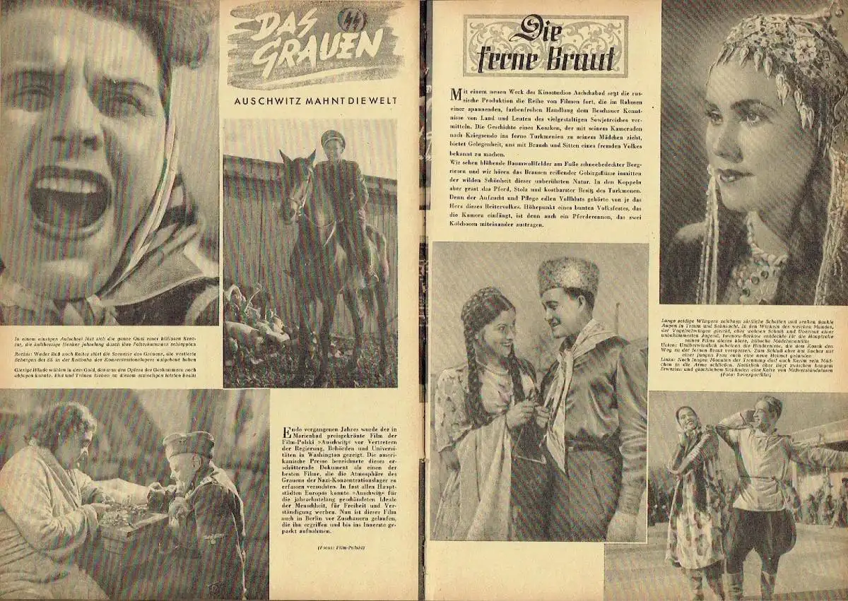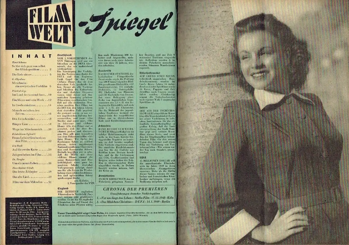 guter Zustand, geringe Gebrauchs- und Alterungsspuren: privat gebunden - Einbandecken und -kanten teils gering abgenutzt - Papier etwas vergilbt, aber Seiten sauber und ordentlich - Zeitschriften vor dem Binden überwiegend mittig senkrecht gefalten / geknickt gewesen - im Heft 12 ein Blatt mit kleinem Eckabriss oben - in Heft 1 und 12 je ein Blatt unten ca. 6 cm eingerissen und durchsichtig geklebt - Ränder beim Binden etwas beschnitten - 3 Blatt von Heft 10 unten gering eingerissen, Zeitschrift der SBZ / DDR über DEFA, Filme aus Ost und West, Schauspieler, Babelsberg, Technik, Politik, Zeitgeschehen, Filmpremieren und etwas Reklame, ca. 21 x 29, je 32 Seiten mit zahlreichen Bildern
