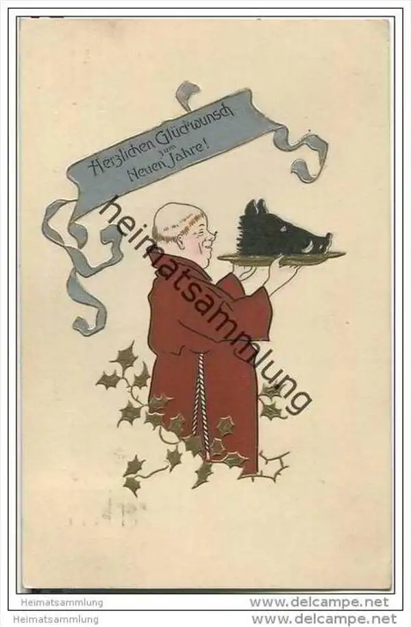 Neujahr - Mönch mit Wildschweinkopf auf einem Tablett - Prägedruck (G26901) gel. 1909