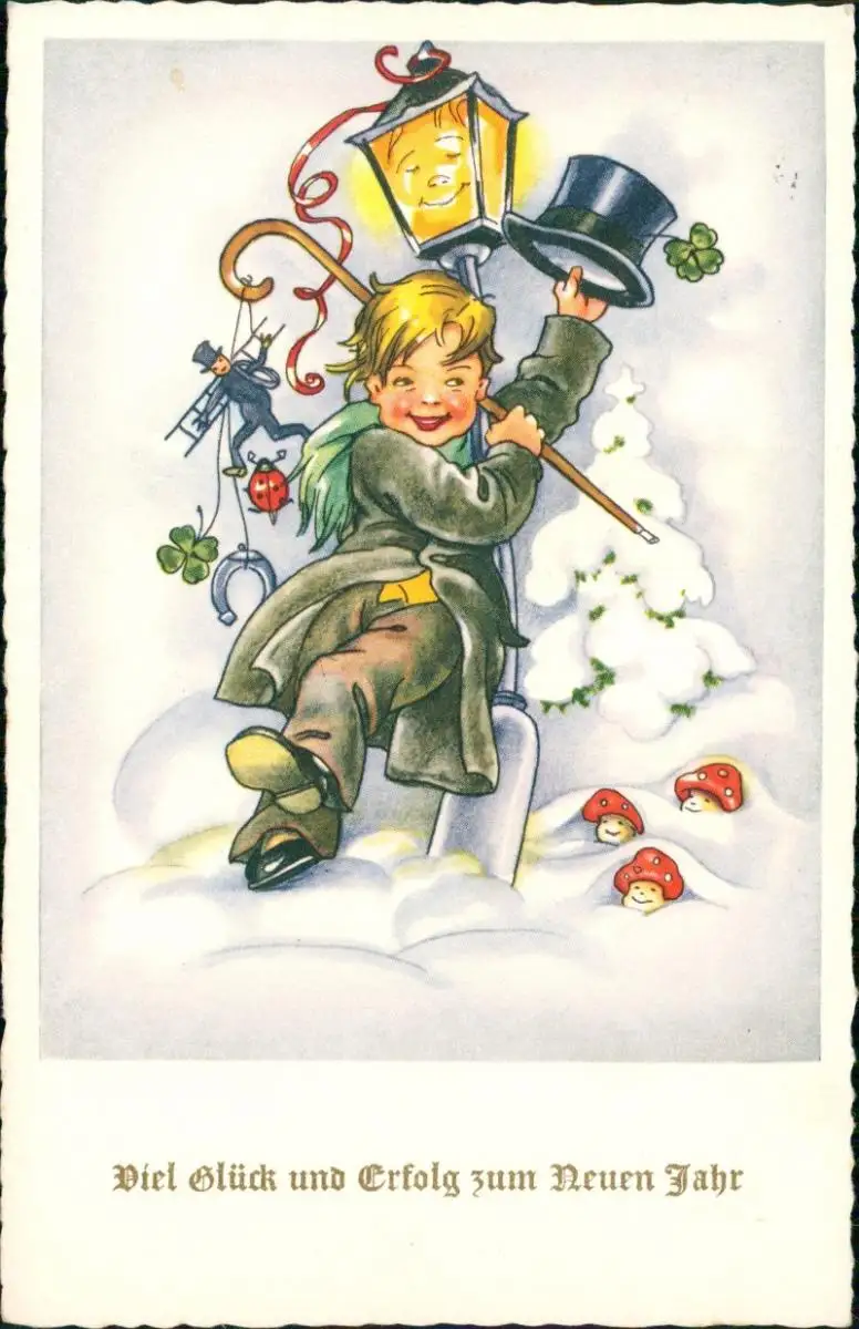 Neujahr Sylvester New Year, Junge Kind mit Glückssymbolen 1950
