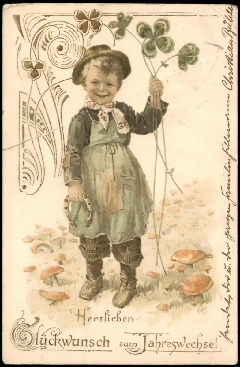 Name: Neujahr Sylvester New Year Junge Kleeblätter Hufeisen JUGENDSTIL