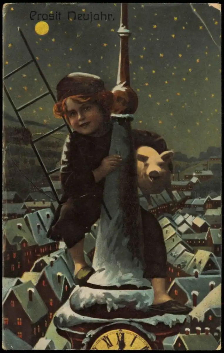 Neujahr Sylvester New Year Junge auf Kirchturmspitze mit Glücksschwein 1910