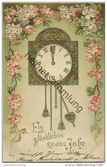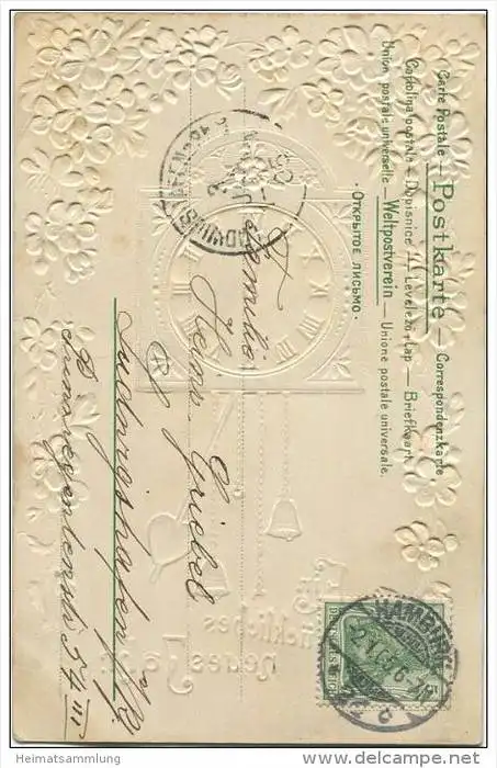 Neujahr - Uhr - Prägedruck - Eckknick oben rechts (E9470) gel. 1905