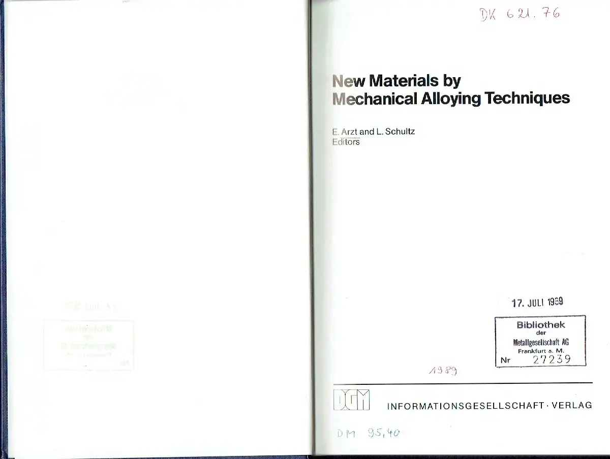 guter Zustand, Gebrauchs- und Alterungsspuren: ehemaliges Bibliotheksexemplar - Titel mit Stempeln und Notizen - Deckel innen mit angeklebtem Papierrest - Vorsatz mit weiterem Stempel - Seiten aber sauber und ordentlich - Einbandecken und -kanten teils gering abgenutzt, The development of new engineering materials is increasingly considered a key technology, because it has the potential of stimulating innovation in all fields of engineering. In particular, non-equilibrium processing methods, such as powder metallurgy and rapid solidification, are receiving considerable attention in the research and development community. Among the processes with the highest potential for tailoring advanced materials, mechanical alloying techniques are of special interest because they offer great flexibility in the choice of constituent materials to be combined. Invented in the 1970's as a method for producing unique dispersion-strengthened alloys for high-temperature applications, mechanical alloying has developed several side branches and stimulated the development of related processes. Since the discovery in 1983 that even amorphous alloys can be produced by mechanical alloying, a new wave of research activity concerned with the possibilities and perspectives of this process has been unleashed. This book is the result of a conference on New Materials by Mechanical Alloying Techniques", designed to present and discuss the state-of-the-art in this fleld and to provide some "cross-fertilization" between the different research groups including materials scientists, chemists, solid state physicists and producers. The conference was held an October 3-5, 1988 in the Kloster Hotel at Calw-Hirsau in the picturesque Black Forest region of West Germany. The group of participants consisted mainly of invited speakers from eleven countries, including three overseas nations (USA, Japan, Israel). This book, which contains the contributions presented orally and in poster form, will make the results of the conference available to a larger community and serve as a future reference for the current state of development." - Mechanical Alloying: Processes and Mechanisms - Mechanical Alloying - A Perspective J. S. Benjamin, Alcoa Center - Dispersion Strengthening by Mechanical Alloying R. C. Benn and P. K. Mirchandani, Huntington - Reaction Milling of Aluminium Alloys G. Jangg, Wien - Basic Phenomena of Glass Formation by Mechanical Alloying Schultz, Erlangen - Amorphous Phase Formation by Mechanical Alloying: Thermodynamic and Kinetic Requirements R. Bormann and R. Busch, Göttingen - Amorphization of a Binary Metal-Metalloid System by Mechanical Alloying G. Veltl, B. Scholz and H.-D. Kunze, Bremen - Compositional Dependence of Glass Formation in Mechanically Alloyed Transition Metal-Transition Metal Alloys J. Eckert, L. Schultz and K. Urban, Erlangen and Jülich - Amorphization of Gd-Co Powders by Mechanical Alloying D. Girardin and M. Maurer, Pont-a-Mousson - Ball Milling Amorphization Mechanism of Ni-Zr Alloys E. Gaffet, N. Merk, and G. Martin, J. Bigot, Vitry - Amorphization of Intermetallic Phases by Mechanical Alloying / Mechancical Milling C. C. Koch, J. S. C. Jang and P. Y. Lee, Raleigh - Amorphization and Phase Transformations during Mechanical Alloying of Nickel-Zirconium F. Petzold, B. Scholz and H.-D. Kunze, Bremen - Structural Transformation and Decomposition of Binary Alloys by Grinding P. I. Loeff, H. Bakker and F. R. de Boer, Amsterdam - Processing of Mechanically Alloyed Materials - Consolidation of Powders under High Pressures - Cold Sintering E. Y. Gutmanas, Haifa - Microstructural Changes during Consolidation - A Comparison of Rapid Solidification and Mechanical Alloying Techniques D. G. Morris and M. A. Morris, Neuchatel - Recrystallization of ODS Superalloys C. P. Jongenburger and R. F. Singer, Baden - Problems Related to Processing of Ferritic ODS Superalloys G. Korb, Reutte - Mechanically Alloyed Materials and their Properties - ODS Superalloys - High Temperature Properties of Dispersion Strengthened Materials Produced by Mechanical Alloying: Current Theoretical Understanding and Some Practical Implications E. Arzt, Stuttgart - Properties of Oxide Dispersion Strengthened Alloys J. D. Whittenberger, Cleveland - Properties and Applications of Iron-Base ODS Alloys H. D. Hedrich, Stuttgart - Analysis and Modelling of the Creep-Fatigue Behaviour of Oxide Dispersion Strengthened Superalloys D. M. Elzey and E. Arzt, Stuttgart - Aluminium Alloys - Mechanical Alloying of Light Metals R. Sundaresan and F. H. Froes , Dayton - Properties and Applications of Dispersion Strengthened Aluminum Alloys V. Arnhold and K. Hummert, Radevormwald - Creep in Dispersion Strengthened Aluminium Alloys at High Temperatures - A Model Based Approach J. Roster and E. Arzt, Stuttgart - Elevated Temperature Deformation Behaviour of Mechanically Alloyed Rapidly Solidified Al-8.4%Fe-3.4%Ce Alloy L. Övecoglu and W. D. Nix, Heerlen and Stanford - Permanent Magnets - Mechanically Alloyed Nd-Fe-B Permanent Magnets L. Schultz, K. Schnitzke, and J. Wecker, Erlangen - Nonequilibrium Phases - Development of Nanocrystalline Structures by Mechanical Alloying W. Schlump and H. Crewe, Essen - Amorphous and Nano-meter Order Grained Structures of Al-Fe and Ag-Fe Alloys Formed by Mechanical Alloying P. H. Shingu, B. Huang, J. Kuyama, K. N. Ishihara and S. Nasu, Kyoto - Mechanically Alloyed Metals with Non-Equilibrium Phases A. Inoue and T. Masumoto, Sendai - Structural and Thermal Analysis of New Systems Prepared by Mechanical Alloying G. Cocco, S. Enzo. L. Schiffini and L. Battezzati, Sassari - Topical Discussion: - Applications and Future Perspective of Mechanical Alloying - Author Index - Subject Index and Alloу Index - List of Participants, Leinen, ca. 16 x 23,5, 373 Seiten mit zahlreichen Bildern