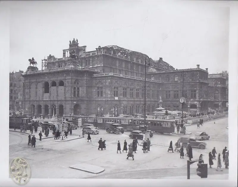 Bemerkungen: Orig.-Presse-Photographie der Wiener Staatsoper nach dem amerikanischen Bombardement am 12. März 1945. Zu sehen ist die Vorderfront, die schon vorsorglich vermauert worden war und erhalten blieb während das Dach einstürzte. Zuschauerränge und Bühne wurden ebenfalls ein Raub der Flammen. Das Photo wurde von der Kreuzung Ring/Operrngasse/Kärntnerstraße aus aufgenommen. - Rückseitig montierter Pressetext.: "This is the Vienna (Austria) Opera House on the left, looking at the intersection of the Opernring (an avenue), and the Kaerntner Strasse, which is comparable to 42nd St. and Fifth Ave., in New York City, The Opera House was virtually destroyed by bombs during the war. The view looks down Kaerntner Strasse, which before the war, housed some of the world`s finest shops".