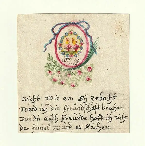 Bemerkungen: Freundschaftskarte auf Kreidepapier, die recto oben ein Ei mit Schleife über einer Blumengirlande zeigt. Auf dem Ei sind in einem Blumenkranz zwei flammende Herzen über zwei Monogrammen (CM? u. EE?) und der Jahreszahl "1785" zu sehen. Verso mit zeitgenössischer Widmung in eigentümlicher Orthographie: "... Teufel bethen, und Engel fluchen, un[d] Katzt und Meüße dich beschuchen dann hör ich auf dein H[erz?] (Abkürzung) zu seyn".