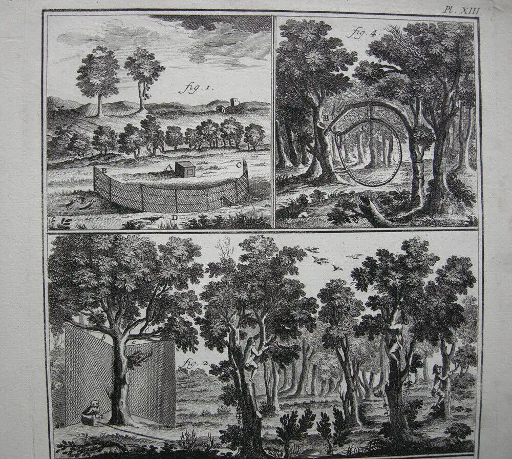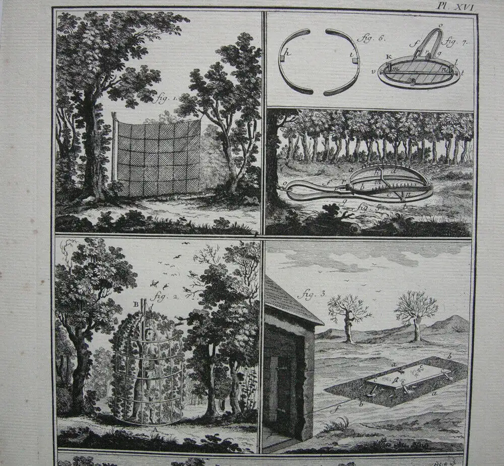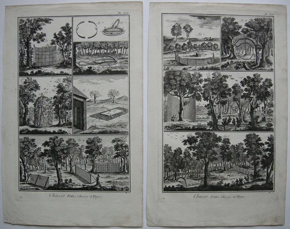 Niederjagd Fallen 9 Kupferstiche auf 2 Blatt Encyclopedie d'Alembert 1770