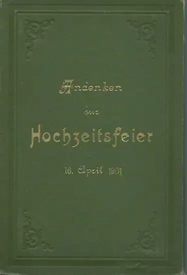 8°. Grüne Original-Leinenmappe mit vergoldeter Aufschrift. Darin lose liegend, jeweils in Druckschrift: 1.) Klappkarte mit der Bekanntgabe der Verlobung der Anna Nisch mit Karl Morgen im December 1898 2.) Einladung zur Hochzeitsfeier am 16. April 1901 3.) 2 Menü - Karten für Bräutigam und Braut 4.) 2 Blatt Tafel-Lieder zur Vermählungsfeier. Alle Teile bis auf den Einband leicht altersfleckig