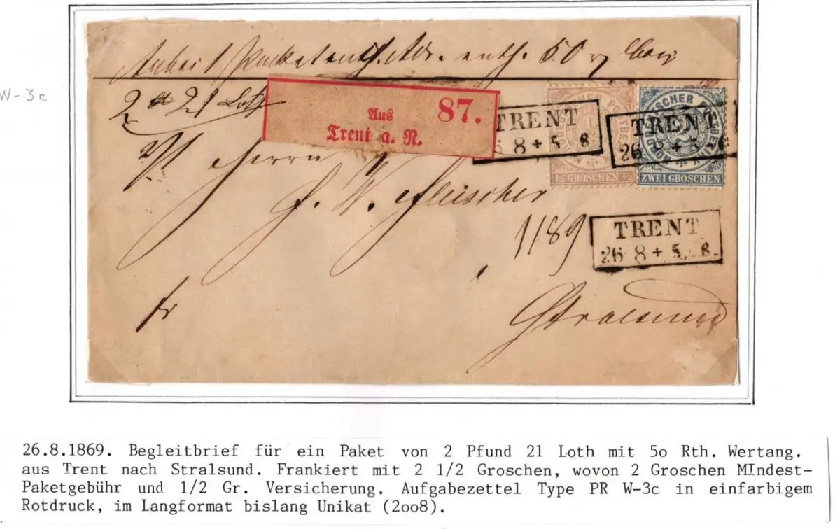 Norddeutscher Bund Paketbegleitbrief Wertsendung Trent - Stralsund #IO532