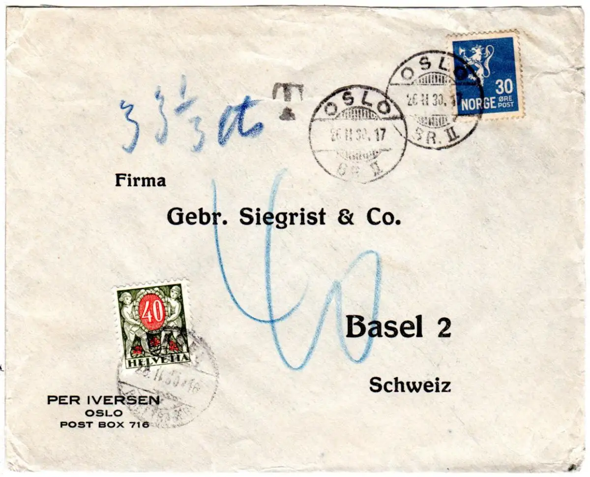 Norwegen 1930, 30 öre auf Brief v. Oslo n. Basel m. Schweiz 40 C. Portomarke