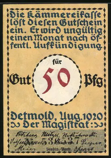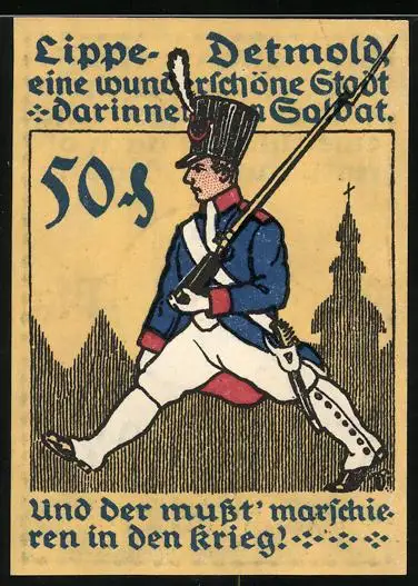 Notgeld Detmold 1920, 50 Pfennig, Soldat marschiert in den Krieg