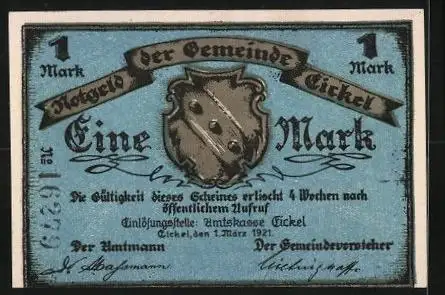 Notgeld Eickel 1921, 1 Mark, Wappen, Burg Eickel, Ritter