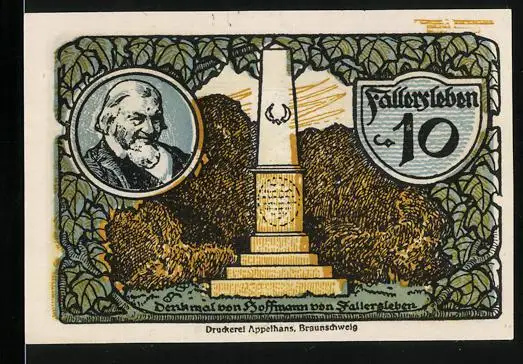 Notgeld Fallersleben 1920, 10 Pfennig, Hoffmann von Fallersleben Denkmal
