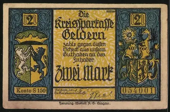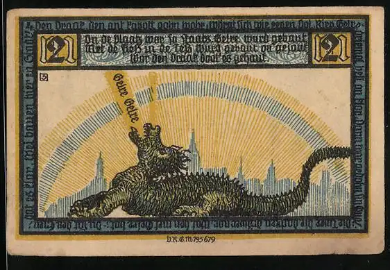 Notgeld Geldern 1922, 2 Mark, Der Drache vor der Stadt