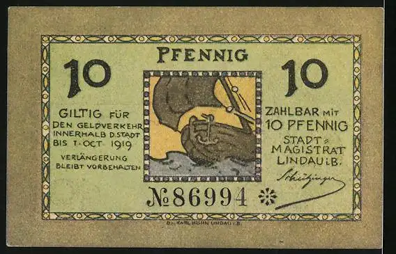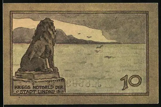 Notgeld Lindau i. B., 10 Pfennig, Löwenstatue am Wasser