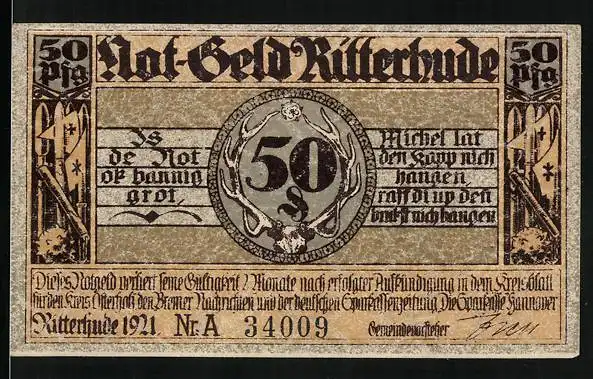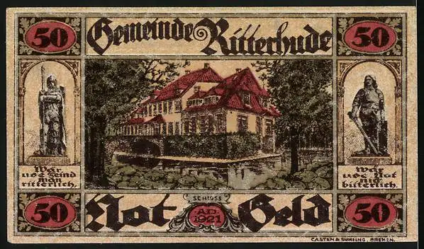 Notgeld Ritterhude 1921, 50 Pfennig, Schloss, Ritterstatuen