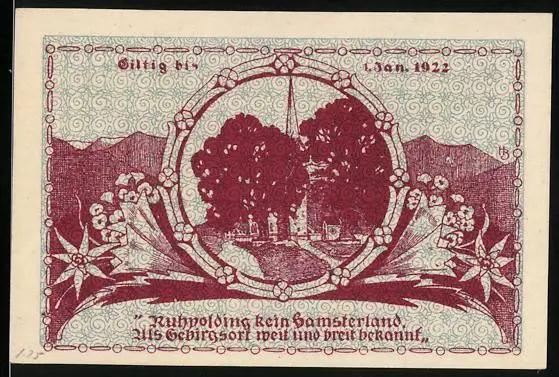 Notgeld Ruhpolding 1921, 50 Pfennig, Ortspartie mit Kirche