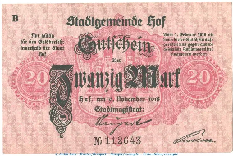 Gutschein / Banknote über Zwanzig Mark , Stadt Hof , GroßnotgeldBundesland : Bayern  ,  Geiger : 239.06