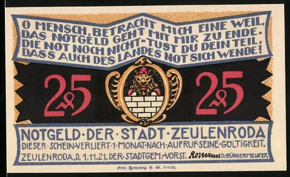 Notgeld Zeulenroda 1921, 25 Pfennig, Strassenpartie mit einer Kirche