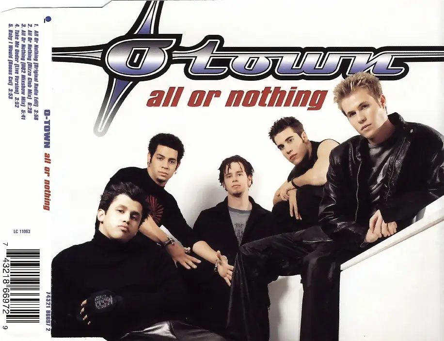 CD Single O-Town - All Or Nothing, Zustand CD VG+ Hülle M-; Made in Germany 2001 J Records 74321 86697 2, Tracks Original Radio Edit 3:58, Rizzo Club Mix 6:28, HQ2 Mixshow Mix 5:41, Take Me Under [Live Vers.] 3:52, Baby I Would [Bonus Cut] 3:53