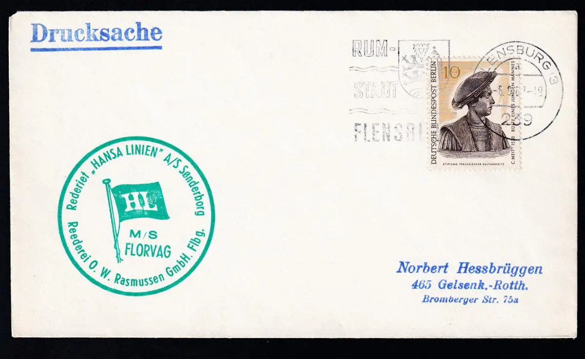 OSt. Flensburg 5.6.66 + Cachet MS Florvag auf Brief