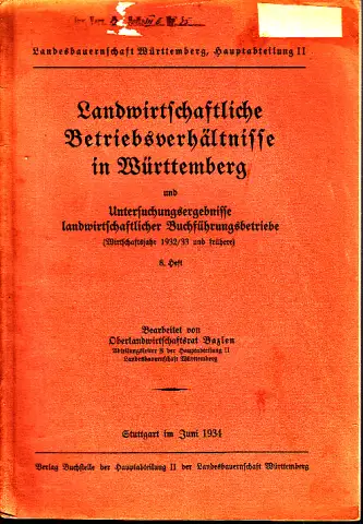 Landwirtschaftliche Bertriebsverhältnisse in Württemberg; Wirtschaftsjahr 1932/33 und früher; Untersuchungsergebnisse landwirtschaftlicher Buchführungsbetriebe; 8. Heft; Wirtschaft; Oberlandwirtschaftsrat Bazlen
