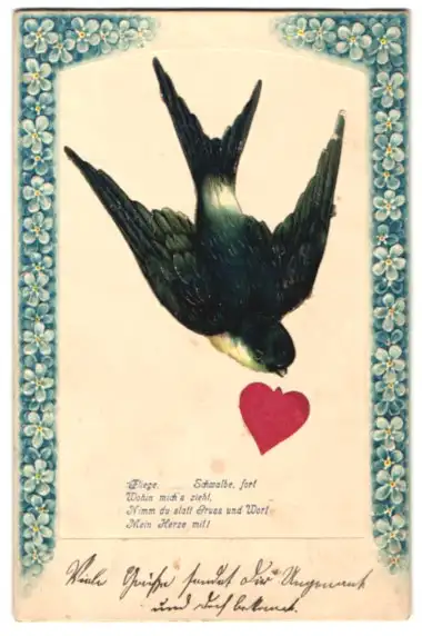 Oblaten-AK Schwalbe mit Herz