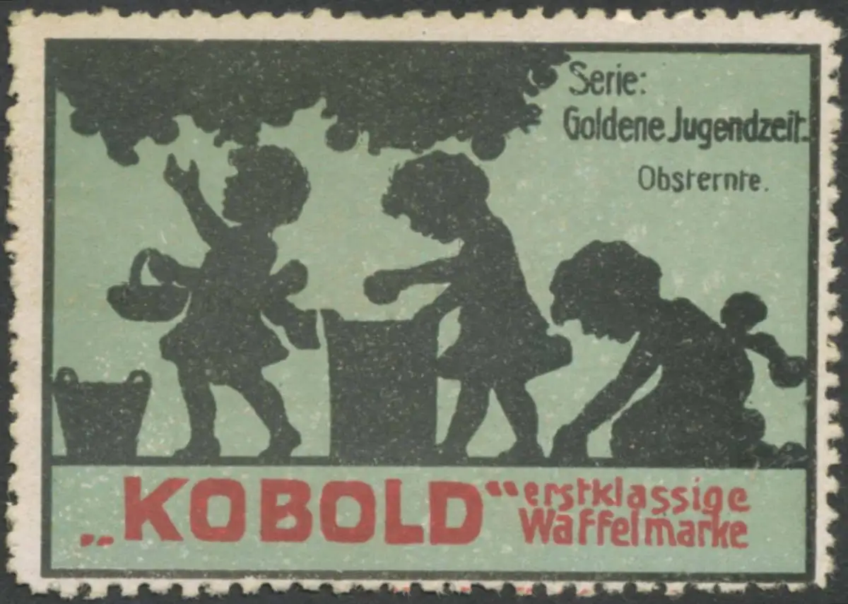 Kobold erstklassige Waffelmarke, Waffelfabrik, Essen, Leipzig, Breslau, Serie: Goldene Jugendzeit, Druck: Carl Fleischer, Cossebaude-Dresden, Größe/Zustand: 4x6 , guter Zustand, Original alte Reklamemarke die seinerzeit für die Werbung benutzt wurde