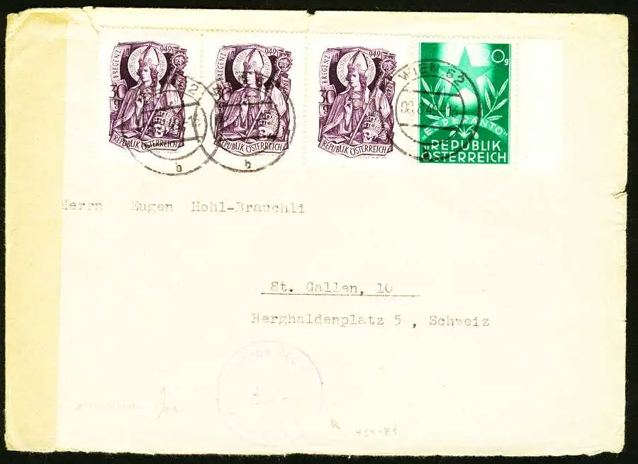 20g Wert Österreichischer Esperanto-Kongress in Graz zusammen mit drei mal 936 auf Zensurpost-Brief von WIEN nach St. Gallen, Zensurpost (454)