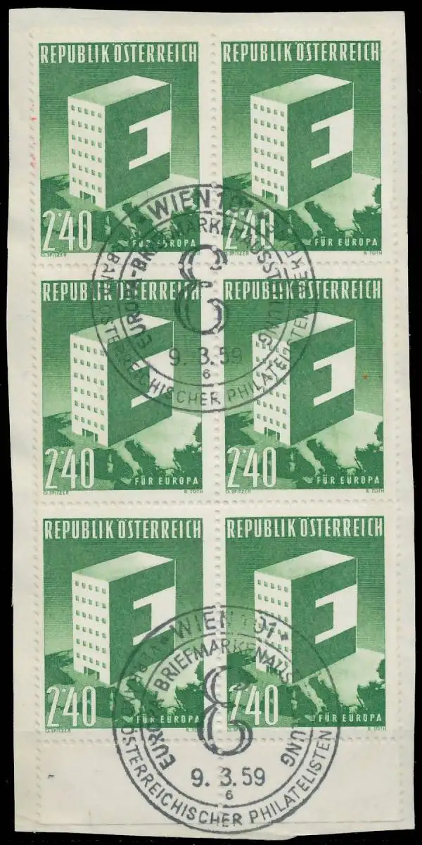 2,4S Wert aus der Ausgabe Europa 1959, 6er-Block auf Briefstück