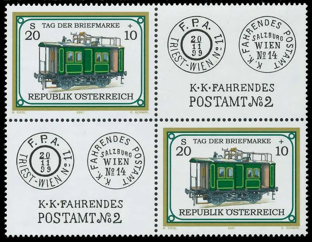 20S + 10S Wert aus der Ausgabe Tag der Briefmarke 2001, Viererblock mit Zierfeld in oben rechts und unten links (MichelNr.: 2345)