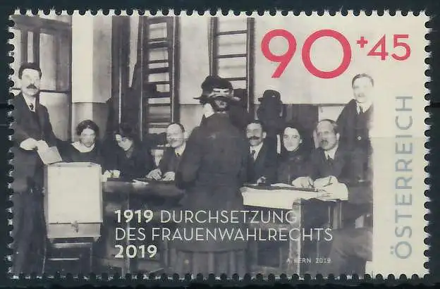 90 + 45 C Wert aus der Blockausgabe 100 Jahre Verband österreichischer Philatelistenvereine, 100 Jahre Frauenwahlrecht