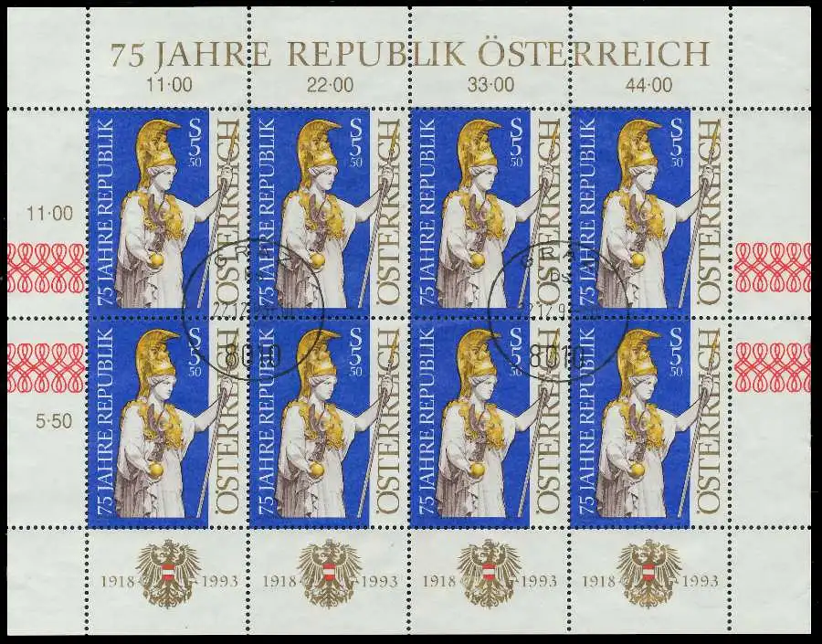 5,5S Wert aus der Ausgabe 75 Jahre Republik 1993 im Kleinbogen (ÖS 44 = 3,5 Euro PP)