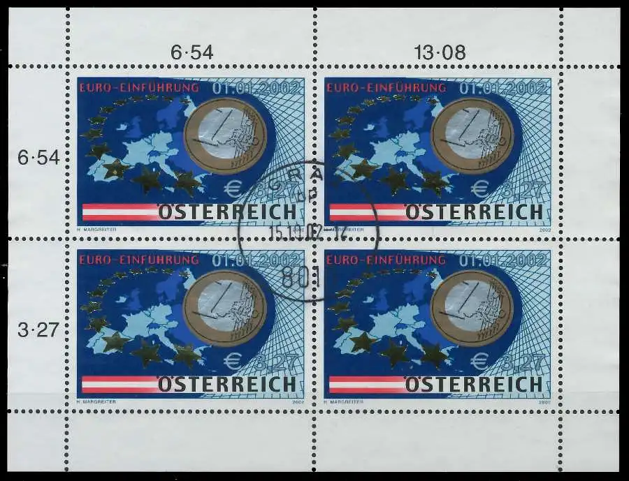327 Cent Wert aus der Ausgabe Euro Einführung, kpl. Kleinbogen mit 4 Marken