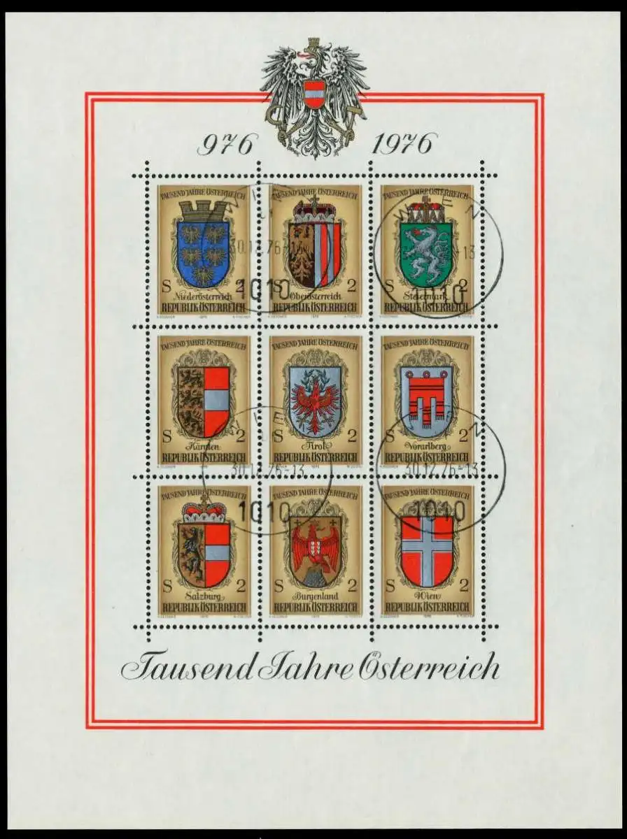 Block-Ausgabe 1000 Jahre Österreich, Bundesländer, Wappen, mit Tagesstempel WIEN, die Stempel können auch anders liegen, als wie am Beispielbild angezeigt. (MichelNr.: 1522, 1523, 1524, 1525, 1526, 1527, 1528, 1529, 1530)