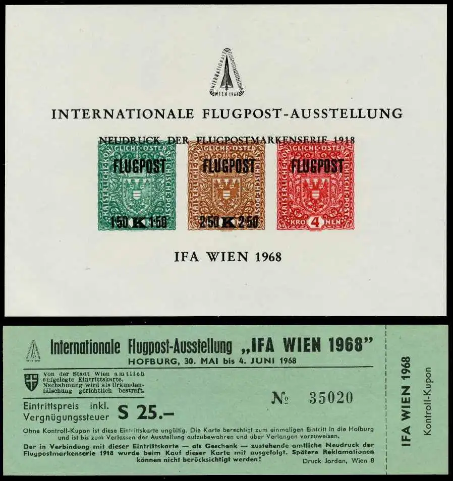 Gedenkblatt zur Internationalen Flugpostausstellung IFA WIEN 1968 zusammen mit Eintrittskarte (rückseitig Reklame Austria Philatelist)