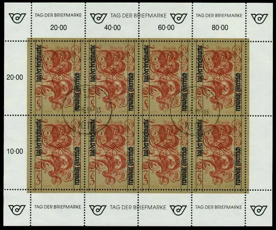 7S + 3S Wert aus der Ausgabe Tag der Briefmarke 1991 im Kleinbogen mit Tagesstempel WIEN