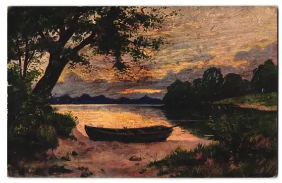 Ölgemälde-Imitations-AK Anliegendes Boot in der Abenddämmerung