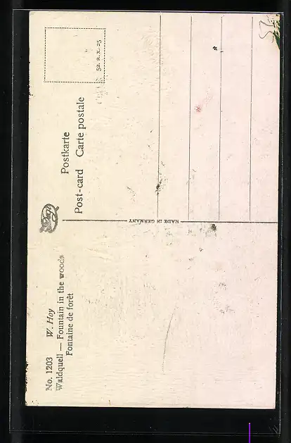 Personenbezogene Daten auf der Rückseite der Karte wurden durch blauen Textmarker unkenntlich gemacht. Die blauen Stellen sind auf die Vorderseite durchgeweicht und wirken sich negativ auf das Postkartenfoto aus