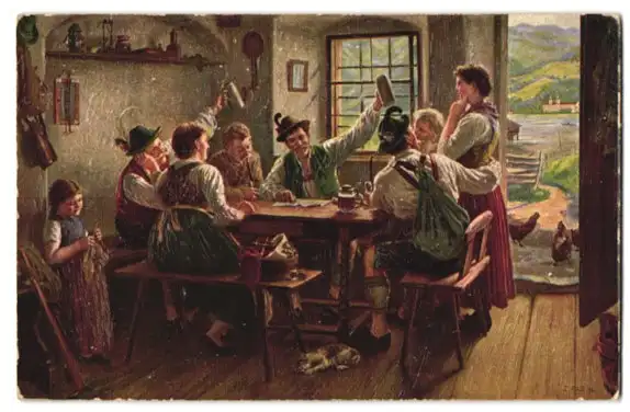 Ölgemälde-Imitations-AK In fröhlicher Runde, F. Rau