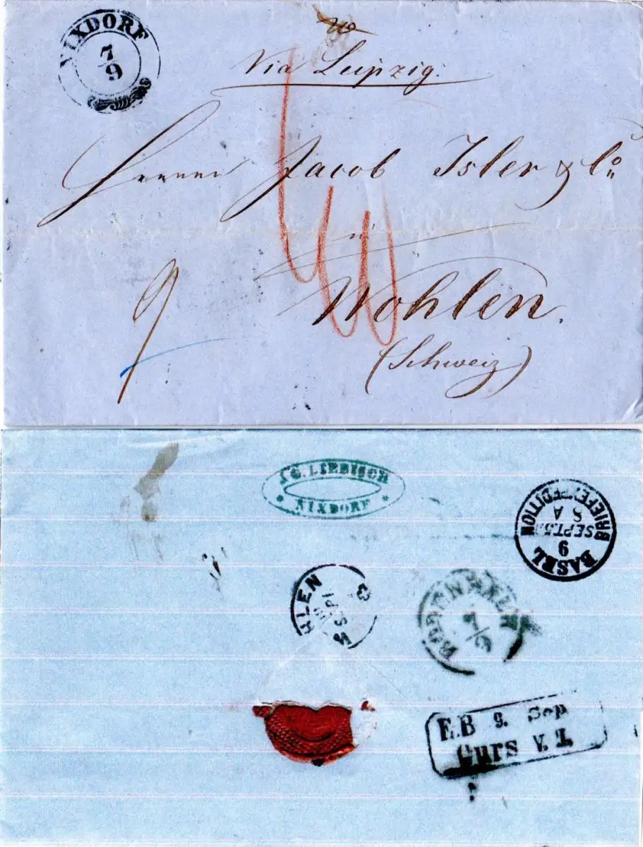 Faltbrief m. kpl. Inhalt u. diversen rücks. Stempeln u.a. Baden Bahnpost. Vorders. Vermerk "via Leipzig" u. rücks. Grenzstpl. BODENBACH.