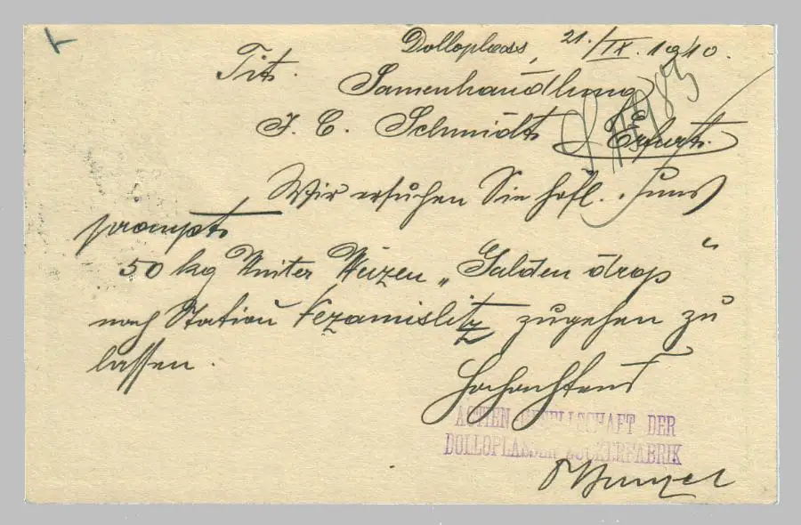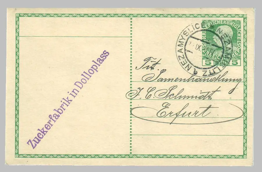 Österreich 1910 Ganzsache ab NEZAMISLITZ in Böhmen aus Dolloplass Zuckerfabrik nach Erfurt