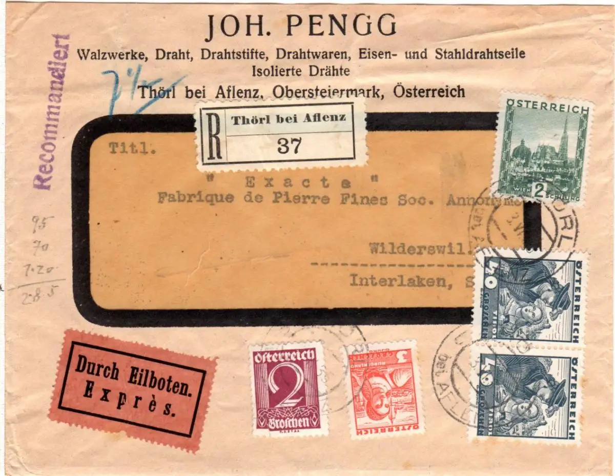Einschreiben Eilboten Brief mit portorichtiger Frankatur in die Schweiz. Dabei die auf Brief gute 2 Schilling Marke, Gesamtporto 2,85 S. (2 Gr. violett m. Mangel unten links, siehe scan). Firmenbrief J. Pengg m. rücks. Ankunftstpl.