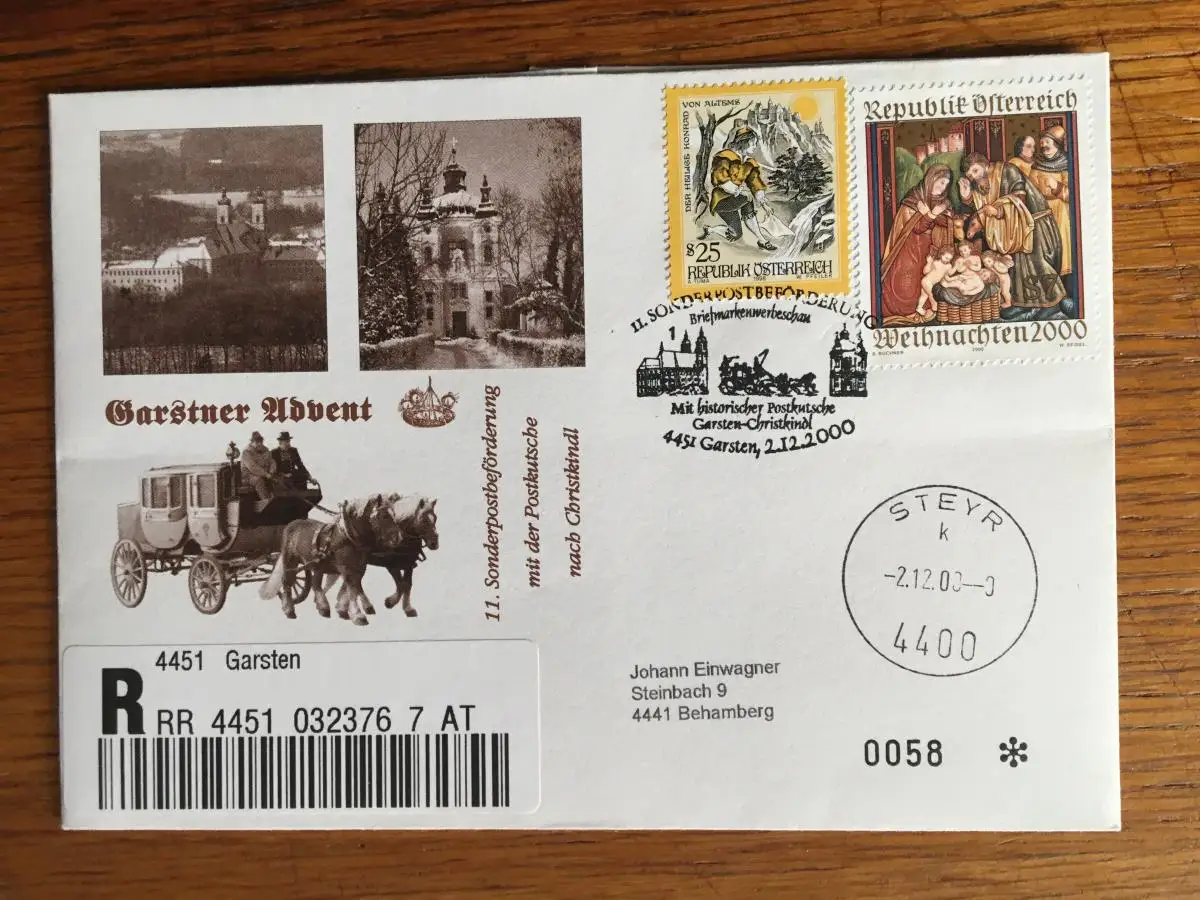 Österreich, Garstner Advent REKO Brief 2. 12. 2000, Sonderpost mit Postkutsche