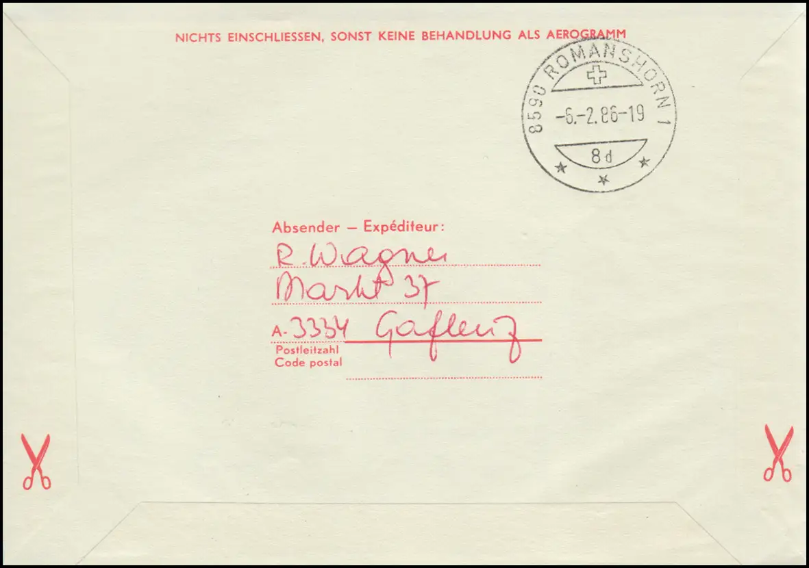 Luftpostfaltbrief mit Sonderstempel "WIEN - AEROGRAMME IN ALLE WELT / Sonderschau", Ankunftsstempel in der Schweiz ROMANSHORN 14.3.86