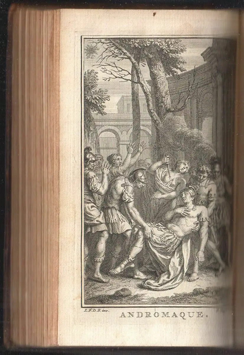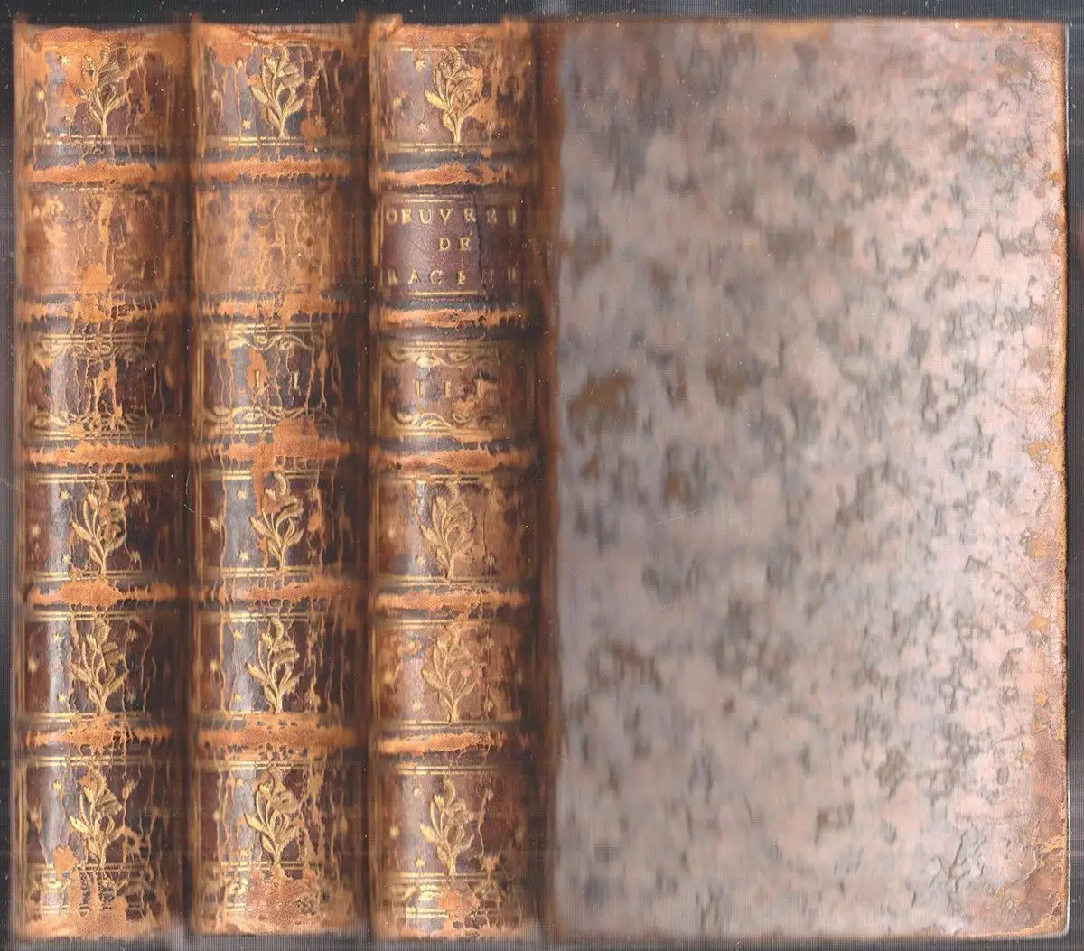 Amsterdam, Arkstée & Merkus 1750. Nouvelle Edition. Augmentée de diverses Pièces & de Remarques &c. Avec de très-belles Figures en Tailles douces.3 vols. kl.-8°. XL, 428; 3 Bll., 482; 2 Bll., 428 S. Mit 2 gest. Titelportr. u. 3 gest. Tielvignetten u. 12 Kupfertaf von Tanje nach L.-F. Du Bourg. Ldr. d. Zt. Rü. u. Ecken berieb.