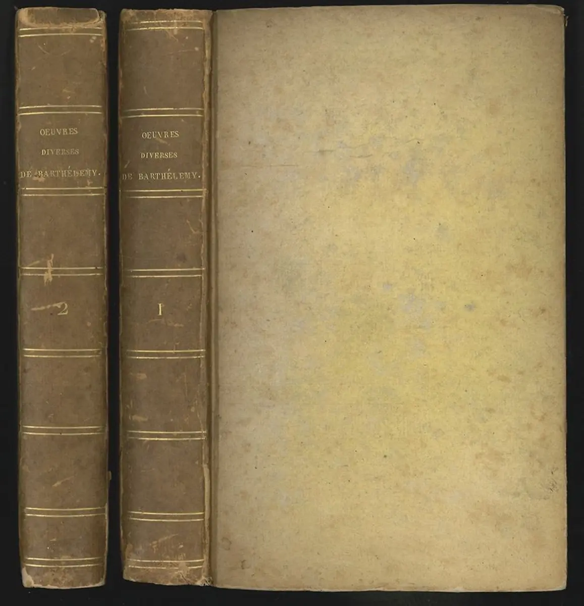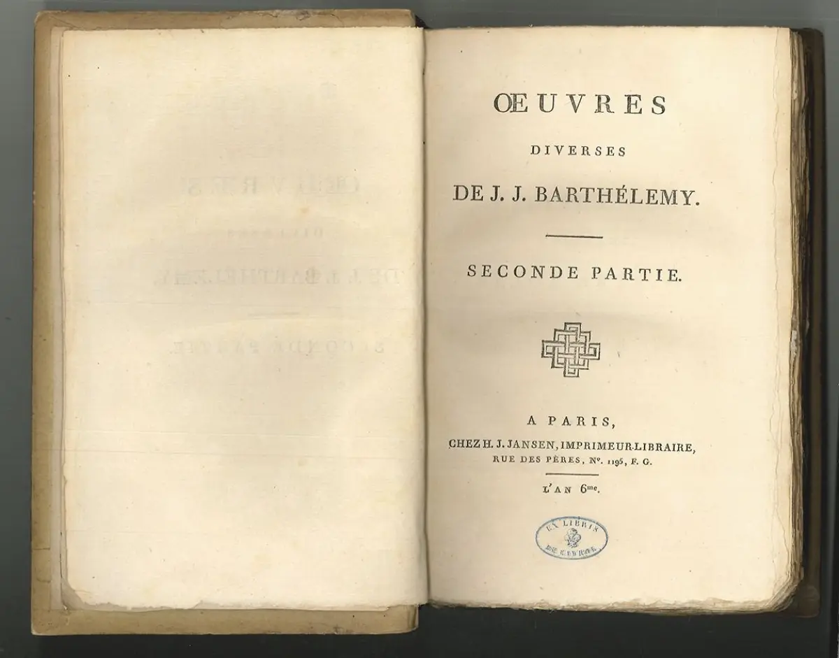 Bemerkungen: EA. - Erstausgabe der 2-bändige Werkausgabe von Jean-Jacques Barthélemy (1716-1795), der als Altertumsforscher, Numismatiker und Gräzist u. a. Mitglied der Académie française war. Eine der Tafeln zeigt einen Museumsplan "Plan de la Galerie de Florence". Aus dem Besitz des französischen Politikers Louis Nicolas Jean Joachim de Cayrol (1775-1859). Es liegen mehrere, teils gestempelte Streifbandzettel an de Cayrol bei, die an ein auslaufendes Abonnement erinnern. Im gleichen Jahr erschien auch eine 4-bändige Ausgabe, ebenfalls bei H. J. Hansen.