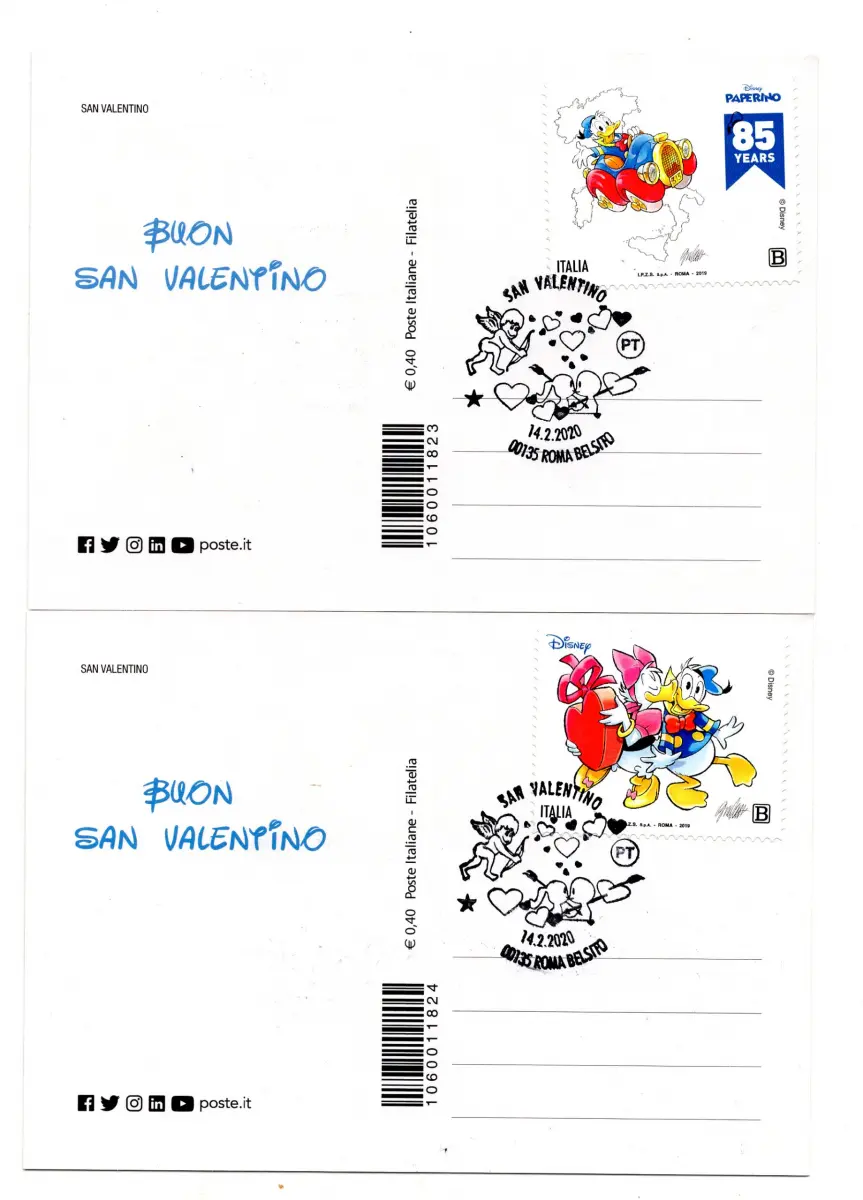 Offizielle Postkarten zum Valentinstag 2020, herausgegeben von Poste Italiane mit bildlicher Sonderstempelung - Reisen Sie nicht Cod, 25/WEB